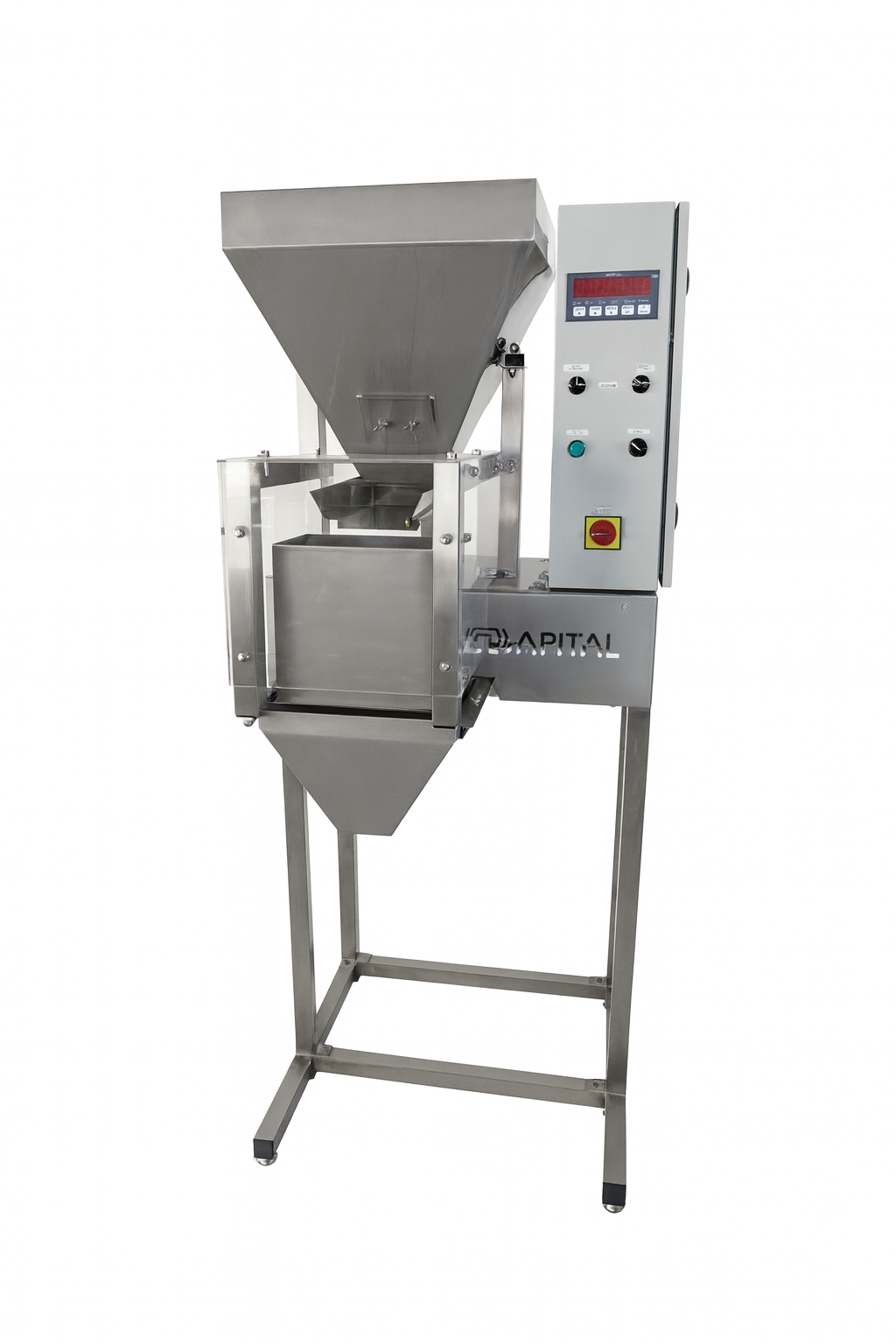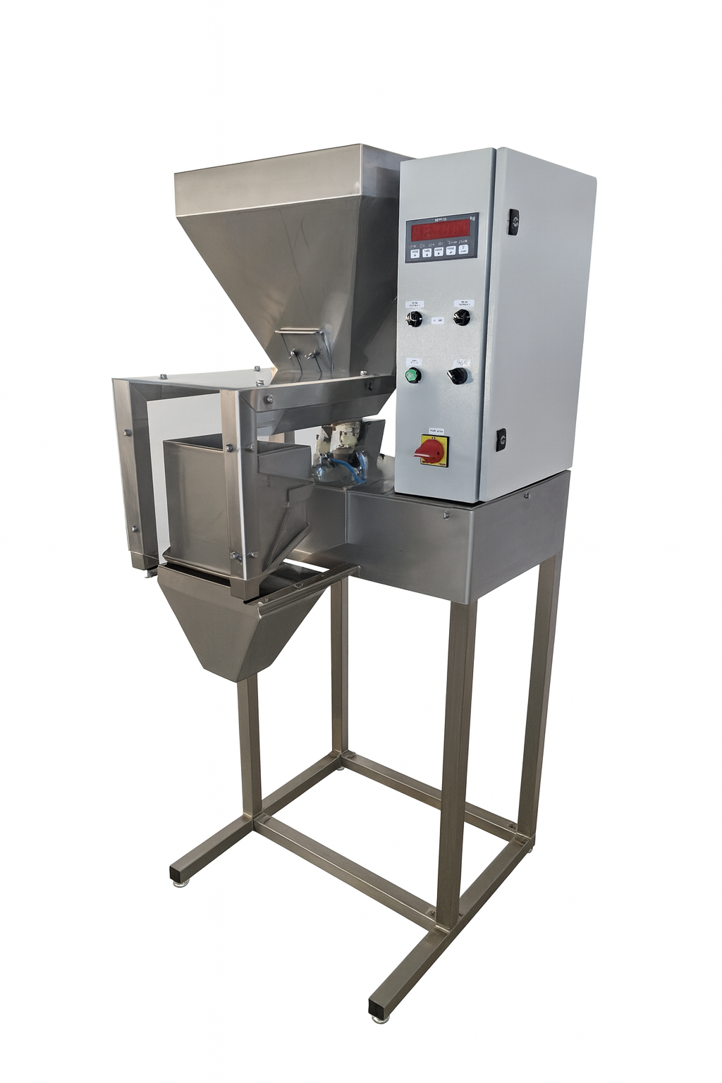 AMBALATOR este o soluție excelentă pentru ambalarea precisă și eficientă a diferitelor produse, precum nuci, leguminoase, cereale și paste. Datorită acționării electrico-pneumatice, asigură o funcționare stabilă și fiabilă, cu un interval de cântărire de la 20 g până la 2 kg. Umplerea funcționează pe principiul semiautomat, iar masa dorită se setează ușor prin regulatorul digital. Procesul de ambalare se desfășoară în două viteze, iar aparatul încetinește automat pe măsură ce se apropie de greutatea setată, asigurând o precizie ridicată la umplere. Produsul se pune în pungi, borcane sau cutii prin simpla apăsare a pedalei, ceea ce deschide recipientul de preluare cu conținutul deja cântărit.